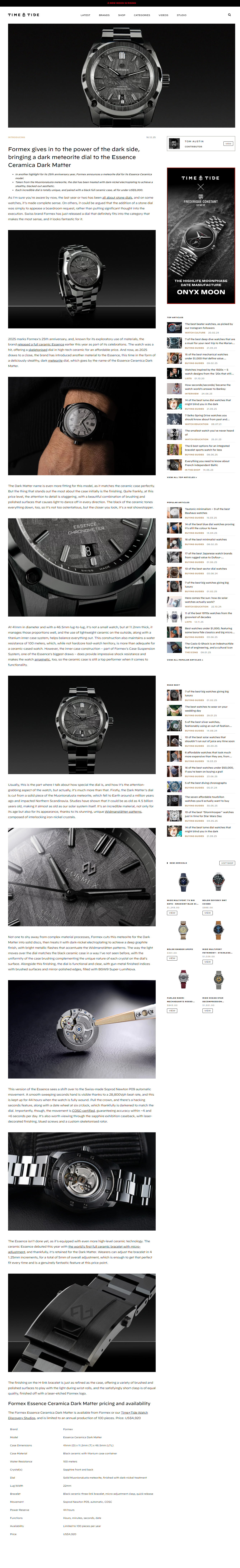Formex gives in to the power of the dark side, bringing a dark meteorite dial to the Essence Ceramica Dark Matter MEDIA #MEDIA Related Articles MEDIA Céramique + météorite : cette nouvelle Formex coche toutes les cases de la montre tendance ! 19th Dec 2025 MEDIA Formex gives in to the power of the dark side, bringing a dark meteorite dial to the Essence Ceramica Dark Matter 19th Dec 2025 MEDIA WatchTime: Introducing the Formex Essence Ceramica Dark Matter 10th Dec 2025 MEDIA Fratello Watches: Formex Doubles Down On Ceramic With The Essence Ceramica Automatic COSC “Dark Matter” 41mm 10th Dec 2025 MEDIA Gear Patrol: This Innovative Blacked-Out Sports Watch Hides a Few Tricks Up Your Sleeve 10th Dec 2025 MEDIA Hourstriker: Formex Essence Ceramica Dark Matter 10th Dec 2025 MEDIA Monochrome Watches: First Look COSC x Ceramic x Meteorite… Meet the Formex Essence Ceramica Dark Matter 10th Dec 2025 MEDIA OracleTime: Formex Essence Ceramica Dark Matter Watch Review 10th Dec 2025 MEDIA WatchPoint: The Formex Essence Ceramica Dark Matter – the cherry on top of the most technologically impressive ceramic watch ever? 10th Dec 2025 STORY Does Formex offer any Black Friday discounts? 28th Nov 2025 REVIEW Hands-on Video Review by OT: The Podcast, FORMEX Essence 39 COSC Chronometer Under $2k?! 25th Nov 2025 REVIEW Hands-on Video Review by Just One More Watch, Finally! But Why Did It Take So Long? Formex Essence 41 Stainless! 25th Nov 2025 REVIEW FORMEX : la marque suisse qui bouscule l’horlogerie traditionnelle – Révélations exclusives 24th Nov 2025 EVENTS Formex at WatchTime Düsseldorf – 24 Oct 2025 28th Oct 2025 REVIEW The Only Field Watch I Really Like - Formex Field Automatic Grey Dial 27th Oct 2025 MEDIA From Limited to Lineage: Formex Essence 41mm COSC Debuts Four Signature Dials and Next-Level Comfort 23rd Oct 2025 REVIEW The Best Everyday Watch Gets An Upgrade! 21st Oct 2025 MEDIA Gear Patrol: One of the Best Watches Under $2,000 Just Got Even Better 20th Oct 2025 REVIEW Formex Essence 41mm Gamaret - A Lot of New Tech, Same Gorgeous Watch 17th Oct 2025 MEDIA Formex Essence 41mm Automatic COSC Receives Stainless Steel Update 17th Oct 2025 MEDIA Monochrome Watches: First Look The New Formex Essence 41mm Automatic COSC in Steel 16th Oct 2025 MEDIA Essence Ceramica 41mm COSC: pura potencia, ajuste preciso y estilo decididamente sólido 6th Oct 2025 MEDIA Nouvelle Formex Essence Ceramica: mouvement Soprod COSC et quatre nouveaux cadrans 3rd Oct 2025 MEDIA Scottish Watches Podcast #712 : Our Loch Ness Monster Revealed Plus The Latest Watches and News 3rd Oct 2025 MEDIA Formex Launch Essence Ceramica COSC Automatic 41mm with Closed Dial 3rd Oct 2025 MEDIA Formex Essence Ceramica COSC: The Art of Ceramic, Redefined 3rd Oct 2025 MEDIA Formex Introduces New Dial Options in the Essence Ceramica Collection 2nd Oct 2025 REVIEW How I'm Saving $10,000 with this Swiss Brand 1st Oct 2025 REVIEW Formex Essence 39 - First Impressions 29th Sep 2025 REVIEW Hands-On With The New Formex Essence Ceramica Automatic COSC 41mm 26th Sep 2025 MEDIA Hourstriker: Formex Essence Ceramica Advanced Materials Accessible Innovation 26th Sep 2025 MEDIA Monochrome Watches: Introducing Formex Dresses its Bestseller in Full-Ceramic with the New Essence Ceramica 26th Sep 2025 REVIEW The best watch money can't buy. FORMEX FIELD AUTOMATIC 25th Sep 2025 REVIEW Formex Essence Ceramica Skeleton COSC GT Review 11th Sep 2025 REVIEW #FOCUS - Formex Field Automatic Gen.2 after 3 days of testing in the Pyrenees! 9th Sep 2025 MEDIA Formex CEO Teases a New Watch & Talks Entrepreneurship - Watch the Tech Podcast 8th Sep 2025 MEDIA Formex Field Automatic Gen 2: robustez y diseño refinado 29th Aug 2025 REVIEW A Return To Elegant Simplicity: Five Watch Options With Arabic Numerals 25th Aug 2025 MEDIA T3: This watch dial is older than humanity itself 18th Aug 2025 MEDIA Gear Patrol: The Most Innovative Affordable Sports Watch Just Changed the Game Again 18th Aug 2025 MEDIA Fratellowatches: Introducing The Formex Essence 41mm Space Ghost — A New Medium Size With A Meteorite Dial And Even More Technical Ingenuity 18th Aug 2025 REVIEW Hands-on Review by Oracle Time: Formex Essence 41 Space Ghost Watch Review 14th Aug 2025 MEDIA Hands-on Debut-Formex Essence 41mm 'Space Ghost' Watch 14th Aug 2025 MEDIA Formex rocket-launches Essence 41mm in ‘Space Ghost’ meteorite 14th Aug 2025 MEDIA Monochrome: First Look The New Formex Essence Space Ghost 41mm Automatic COSC 14th Aug 2025 Review Hands-on Review by Business Montres, Dix evaluations personnelles de dix montres masculines du GPHG2025 31st Jul 2025 REVIEW Hands-on Video Review by SeriousWatches, Formex Essence Leggera FortyThree Space Glacier Limited Edition 31st Jul 2025 REVIEW Hands-on Video Review by SeriousWatches, Formex REEF 39.5mm Automatic Chronometer 300m Green (Pre-owned) 31st Jul 2025 REVIEW The Hottest Watches To Own RIGHT NOW 25th Jul 2025 REVIEW Formex Essence Forty Three Splash 4K Watch Review 22nd Jul 2025