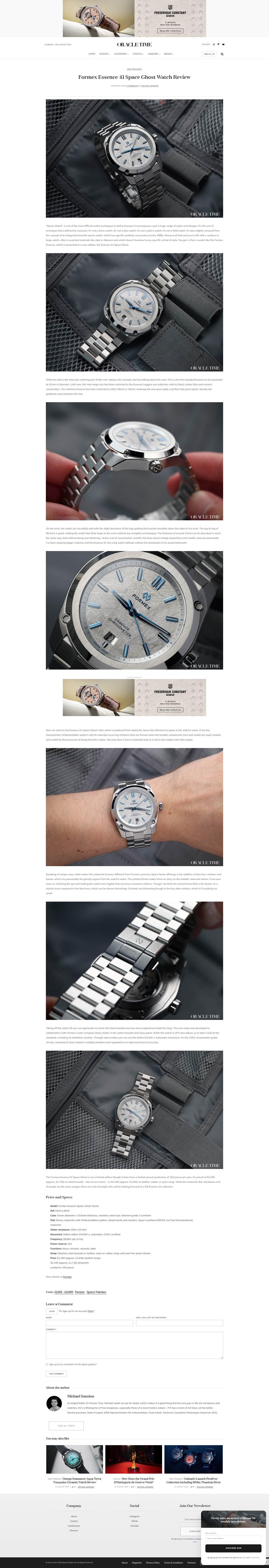 Hands-on Review by Oracle Time: Formex Essence 41 Space Ghost Watch Review REVIEW #REVIEW Related Articles STORY Does Formex offer any Black Friday discounts? 28th Nov 2025 REVIEW Hands-on Video Review by OT: The Podcast, FORMEX Essence 39 COSC Chronometer Under $2k?! 25th Nov 2025 REVIEW Hands-on Video Review by Just One More Watch, Finally! But Why Did It Take So Long? Formex Essence 41 Stainless! 25th Nov 2025 REVIEW FORMEX : la marque suisse qui bouscule l’horlogerie traditionnelle – Révélations exclusives 24th Nov 2025 EVENTS Formex at WatchTime Düsseldorf – 24 Oct 2025 28th Oct 2025 REVIEW The Only Field Watch I Really Like - Formex Field Automatic Grey Dial 27th Oct 2025 MEDIA From Limited to Lineage: Formex Essence 41mm COSC Debuts Four Signature Dials and Next-Level Comfort 23rd Oct 2025 REVIEW The Best Everyday Watch Gets An Upgrade! 21st Oct 2025 MEDIA Gear Patrol: One of the Best Watches Under $2,000 Just Got Even Better 20th Oct 2025 REVIEW Formex Essence 41mm Gamaret - A Lot of New Tech, Same Gorgeous Watch 17th Oct 2025 MEDIA Formex Essence 41mm Automatic COSC Receives Stainless Steel Update 17th Oct 2025 MEDIA Monochrome Watches: First Look The New Formex Essence 41mm Automatic COSC in Steel 16th Oct 2025 MEDIA Essence Ceramica 41mm COSC: pura potencia, ajuste preciso y estilo decididamente sólido 6th Oct 2025 MEDIA Nouvelle Formex Essence Ceramica: mouvement Soprod COSC et quatre nouveaux cadrans 3rd Oct 2025 MEDIA Scottish Watches Podcast #712 : Our Loch Ness Monster Revealed Plus The Latest Watches and News 3rd Oct 2025 MEDIA Formex Launch Essence Ceramica COSC Automatic 41mm with Closed Dial 3rd Oct 2025 MEDIA Formex Essence Ceramica COSC: The Art of Ceramic, Redefined 3rd Oct 2025 MEDIA Formex Introduces New Dial Options in the Essence Ceramica Collection 2nd Oct 2025 REVIEW How I'm Saving $10,000 with this Swiss Brand 1st Oct 2025 REVIEW Formex Essence 39 - First Impressions 29th Sep 2025 REVIEW Hands-On With The New Formex Essence Ceramica Automatic COSC 41mm 26th Sep 2025 MEDIA Hourstriker: Formex Essence Ceramica Advanced Materials Accessible Innovation 26th Sep 2025 MEDIA Monochrome Watches: Introducing Formex Dresses its Bestseller in Full-Ceramic with the New Essence Ceramica 26th Sep 2025 REVIEW The best watch money can't buy. FORMEX FIELD AUTOMATIC 25th Sep 2025 REVIEW Formex Essence Ceramica Skeleton COSC GT Review 11th Sep 2025 REVIEW #FOCUS - Formex Field Automatic Gen.2 after 3 days of testing in the Pyrenees! 9th Sep 2025 MEDIA Formex CEO Teases a New Watch & Talks Entrepreneurship - Watch the Tech Podcast 8th Sep 2025 MEDIA Formex Field Automatic Gen 2: robustez y diseño refinado 29th Aug 2025 REVIEW A Return To Elegant Simplicity: Five Watch Options With Arabic Numerals 25th Aug 2025 MEDIA T3: This watch dial is older than humanity itself 18th Aug 2025 MEDIA Gear Patrol: The Most Innovative Affordable Sports Watch Just Changed the Game Again 18th Aug 2025 MEDIA Fratellowatches: Introducing The Formex Essence 41mm Space Ghost — A New Medium Size With A Meteorite Dial And Even More Technical Ingenuity 18th Aug 2025 REVIEW Hands-on Review by Oracle Time: Formex Essence 41 Space Ghost Watch Review 14th Aug 2025 MEDIA Hands-on Debut-Formex Essence 41mm 'Space Ghost' Watch 14th Aug 2025 MEDIA Formex rocket-launches Essence 41mm in ‘Space Ghost’ meteorite 14th Aug 2025 MEDIA Monochrome: First Look The New Formex Essence Space Ghost 41mm Automatic COSC 14th Aug 2025 Review Hands-on Review by Business Montres, Dix evaluations personnelles de dix montres masculines du GPHG2025 31st Jul 2025 REVIEW Hands-on Video Review by SeriousWatches, Formex Essence Leggera FortyThree Space Glacier Limited Edition 31st Jul 2025 REVIEW Hands-on Video Review by SeriousWatches, Formex REEF 39.5mm Automatic Chronometer 300m Green (Pre-owned) 31st Jul 2025 REVIEW The Hottest Watches To Own RIGHT NOW 25th Jul 2025 REVIEW Formex Essence Forty Three Splash 4K Watch Review 22nd Jul 2025 REVIEW Are Ceramic Watches Cool Yet? - Formex Essence Ceramica 21st Jul 2025 MEDIA Formex Essence Leggera 43 mm : Quand la météorite rencontre l’horlogerie de précision 21st Jul 2025 REVIEW Questi Orologi sono PRONTI A TUTTO per MENO di 1000 euro 21st Jul 2025 REVIEW A Swiss-Made Titanium Field Watch for Under $1,000 - Formex Field Automatic Hands-On 21st Jul 2025 REVIEW How To Easily Change The Bezel On Your Formex Watch - Formex Reef or Formex Reef GMT 21st Jul 2025 REVIEW Formex Essence Ceramica - Best Value Ceramic Watch? 21st Jul 2025 REVIEW Robusto, innovativo e originale: Formex Stratos UTC 21st Jul 2025 MEDIA TRADING $1 FOR $10,000 IN WATCHES 9th Jul 2025 REVIEW Hands-on Review by Mainspring Watch Magazine, Formex Field V2 Basalt Gray 25th Jun 2025