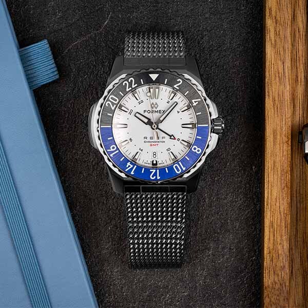 Expanding upon the core concept of the original REEF diver, the FORMEX REEF GMT allows to track three different time zones, without sacrificing any of the REEF's robust build quality or patented interchangeable bezel and bracelet systems. The 42mm stainless steel watch is powered by a self-winding COSC-certified SW330-2 GMT movement that comes in Sellita’s highest quality grade, using top of the line components only found in Chronometer-grade movements. The movement is visible through a sapphire crystal display case back and is beautifully decorated, automatically charging with a custom made skeleton rotor. The thin high-precision caliber allowed to construct the REEF at just 11.4mm thickness and a perceived height of 9.4mm, making it a great fit for travel, adventure and the elegant occasion alike. For any underwater activities, a double gasket construction and screw-down crown are designed and tested for 300 m / 1000 ft of water resistance.